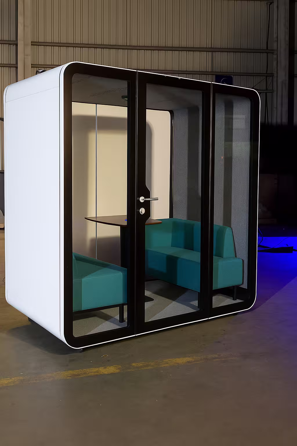 Modern ofisler için geliştirilen akustik ofis görüşme kabini, 4 kişilik oturma kapasitesiyle hem ekip içi toplantılar hem de özel görüşmeler için mükemmel bir ortam sunar. Dış sesleri izole eden yapısı sayesinde içerideki sesin dışarıya sızması engellenir ve görüşmeler gizlilik içinde gerçekleştirilir.